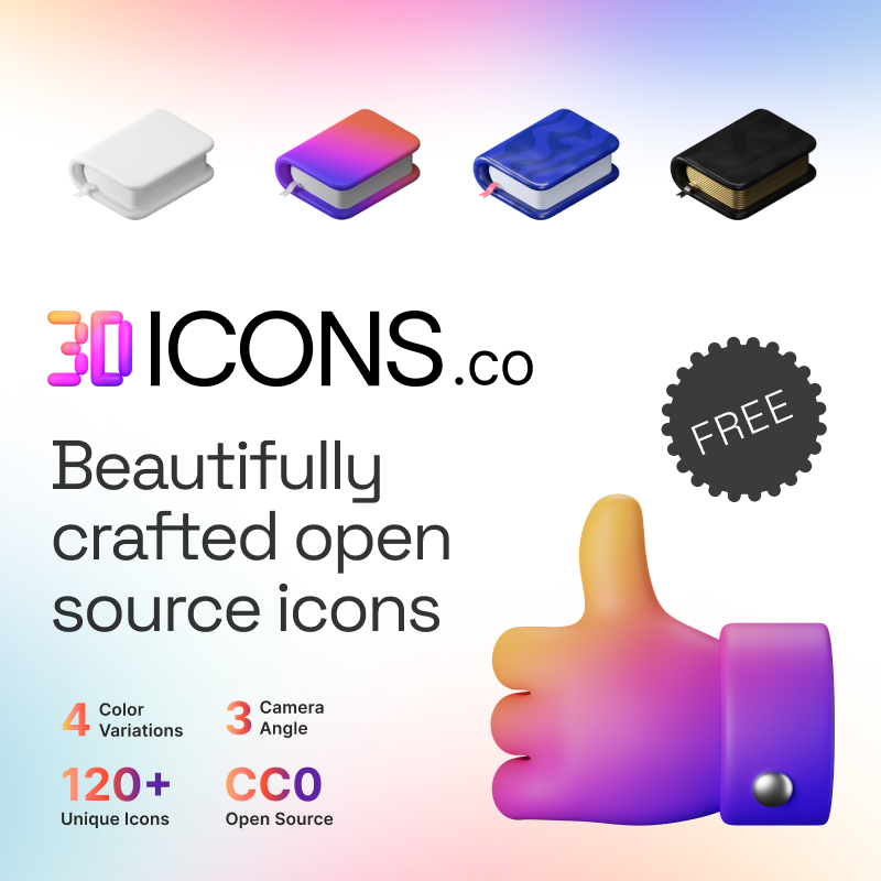 3Dicons is a set of 120+ beautifully crafted open-source icons that have been created in Blender and made available to the community. Under CC0 license, source file FREE.